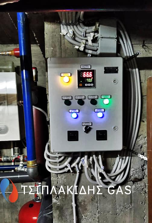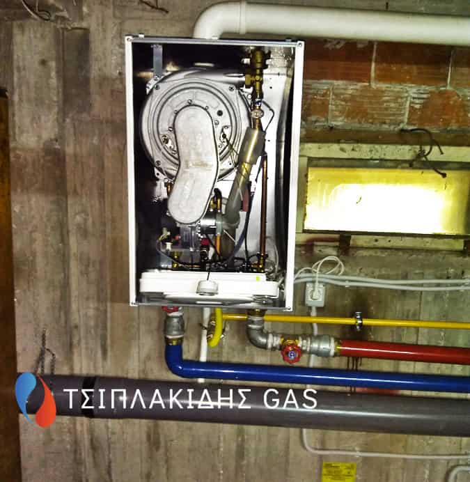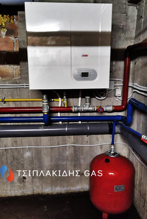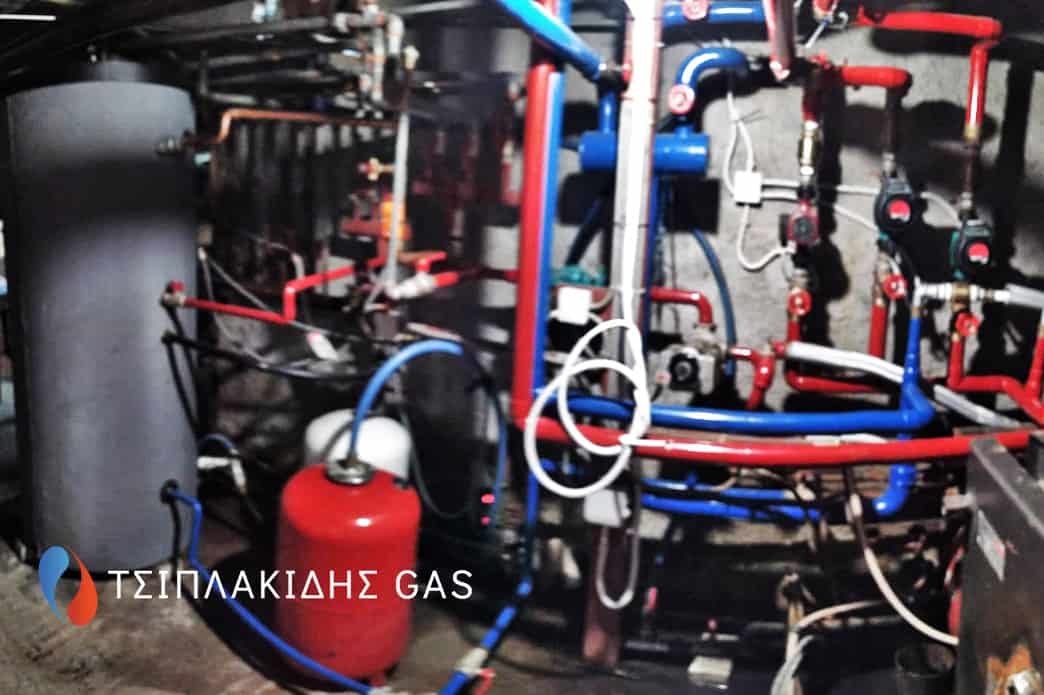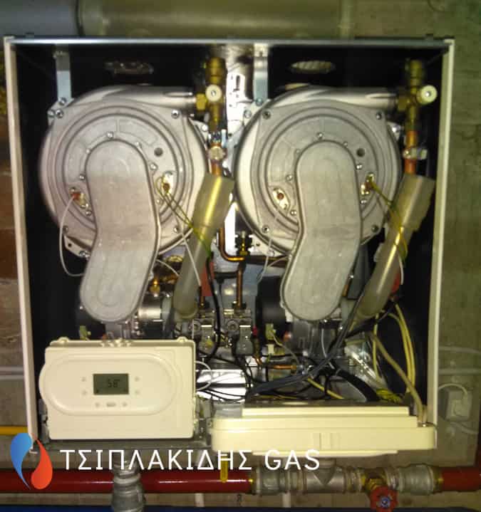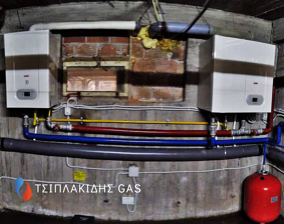 Αντικατάσταση παλαιού λέβητα πετρελαίου με νέας γενιάς επιτοιχων λεβήτων αερίου με πλήρη συνεργασία μεταξύ τους έτσι ώστε να λειτουργούν ακριβώς της ίδιες χρονοωρες μέσω ενός κεντρικού πίνακα. Άψογη συνεργασία μεταξύ των λεβήτων αερίου στη εγκατάσταση προστέθηκε υδραυλικός διαχωριστής – απαερωτης- διαχωριστής λάσπης για την καλύτερη λειτουργία της θέρμανσης μειώνοντας το ΔΤ των πιέσεων των κυκλωμάτων.